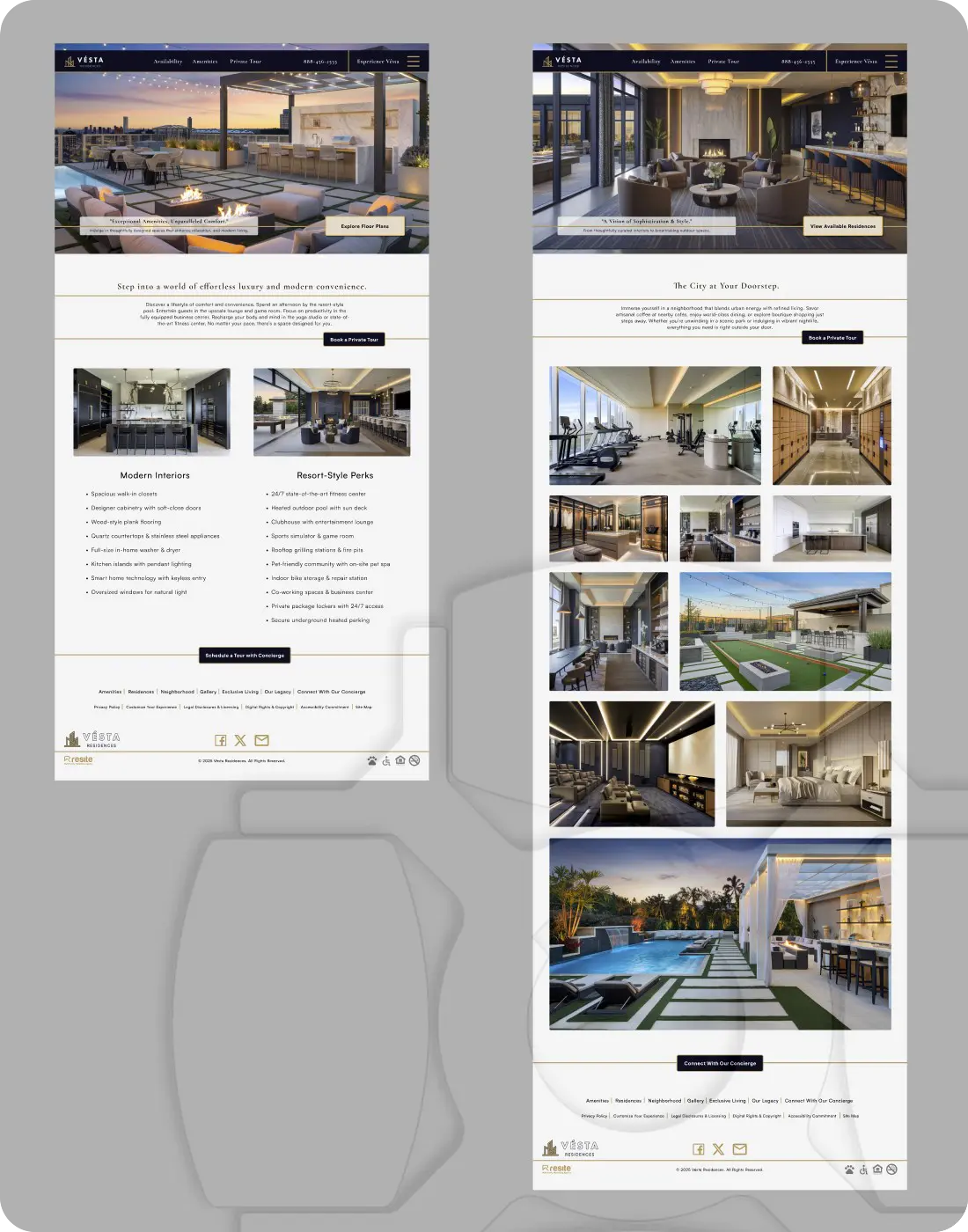 Vésta is a luxury apartment brand that needed a clean, modern marketing website to showcase its residential offerings. I designed a full desktop and mobile experience, including a brand style guide with typography, color palette, button states, and logo treatments. The design emphasizes elegance and clarity, with refined use of whitespace, a simple color system, and thoughtful hierarchy. This image highlights the responsive homepage layout, along with annotations detailing interaction behavior, layout decisions, and branding components. The project was built to scale, allowing for expansion into additional property pages and marketing collateral.